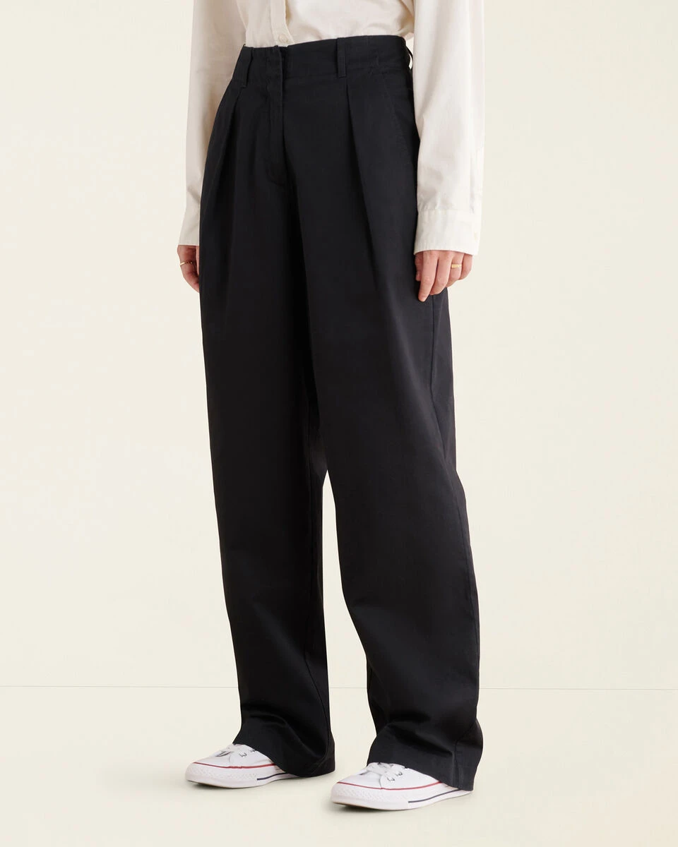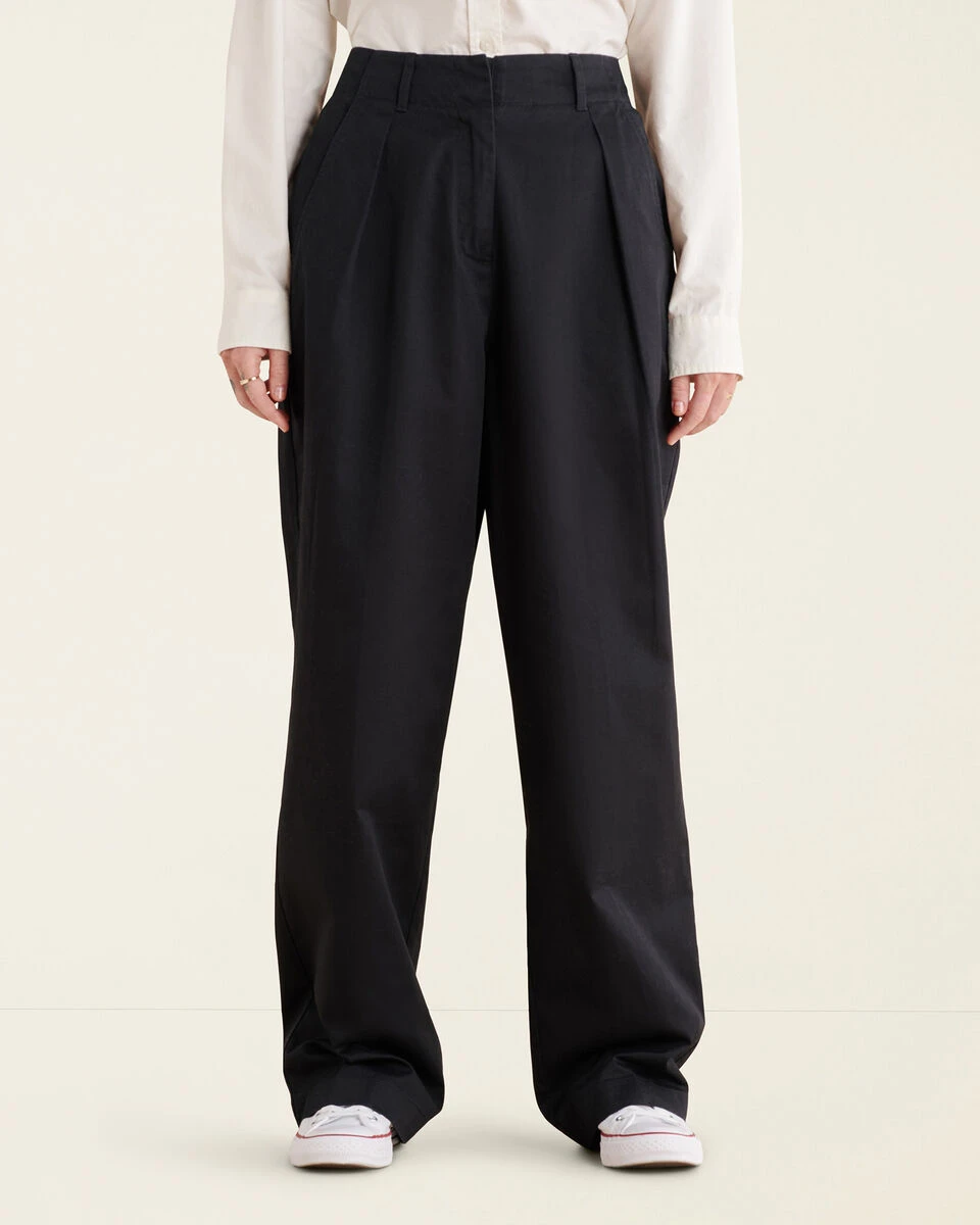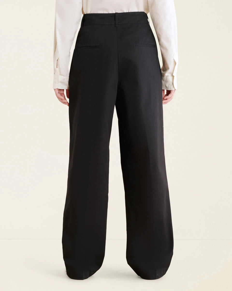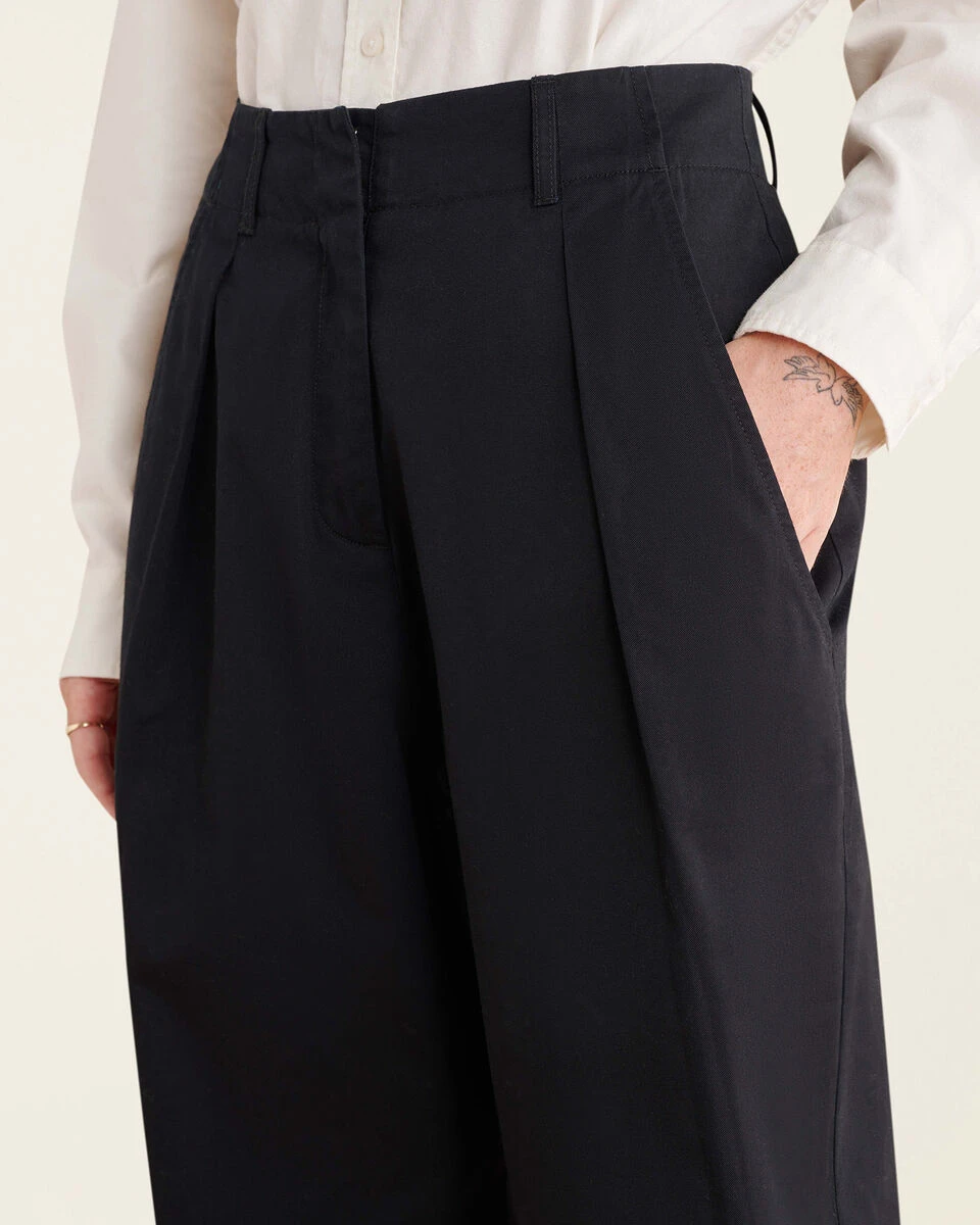 - Wide leg, tapers at ankle