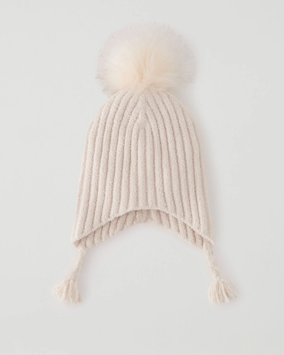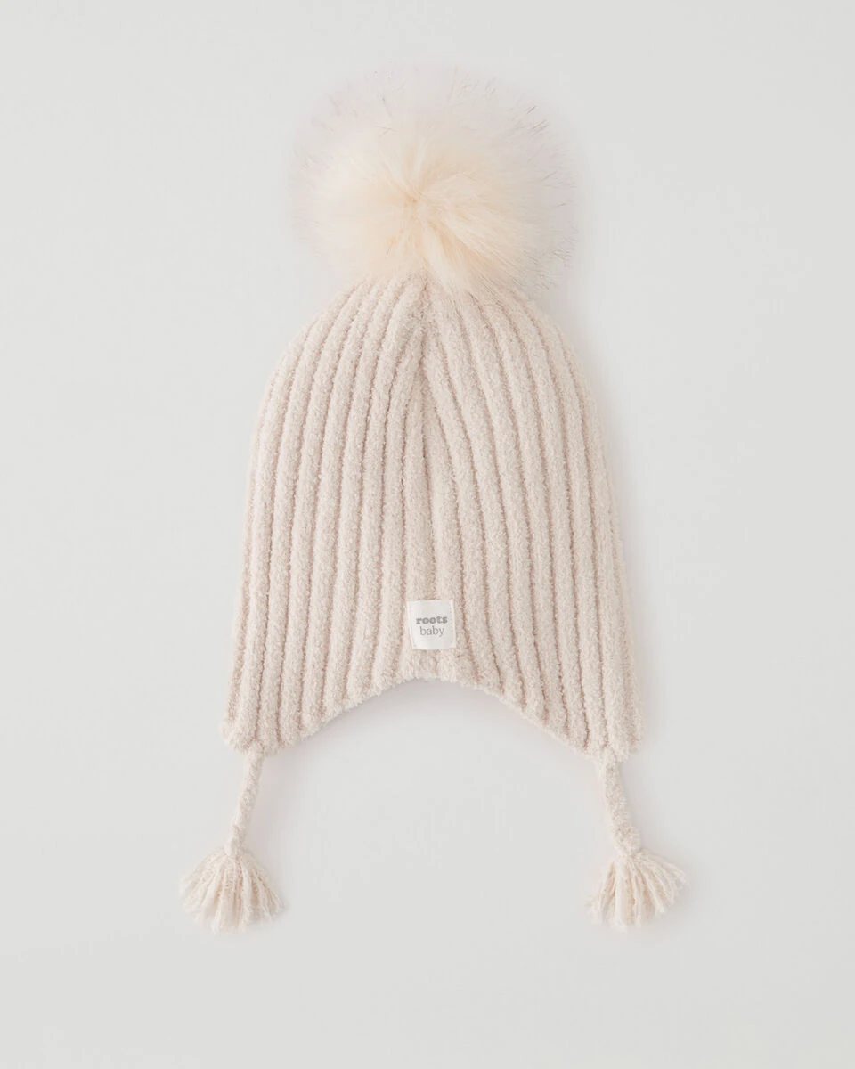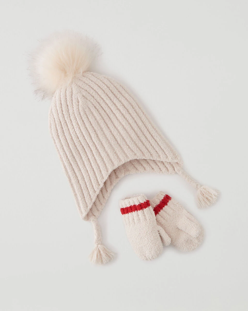 Our Dawson Baby Gift Set is constructed of the super soft chenille yarn, for maximum warmth. Featuring a toque with faux fur pom pom, and matching mittens knit with our signature Cabin striping.