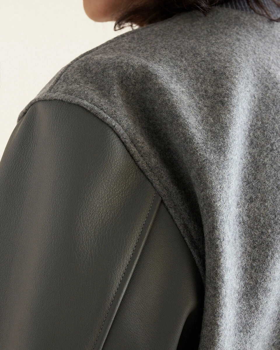 - Leather sleeves and pocket trim