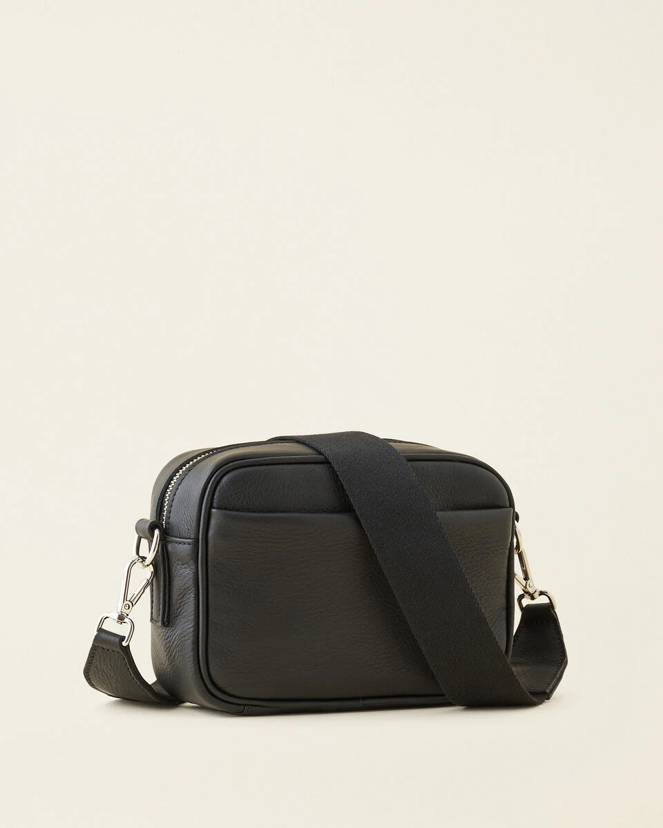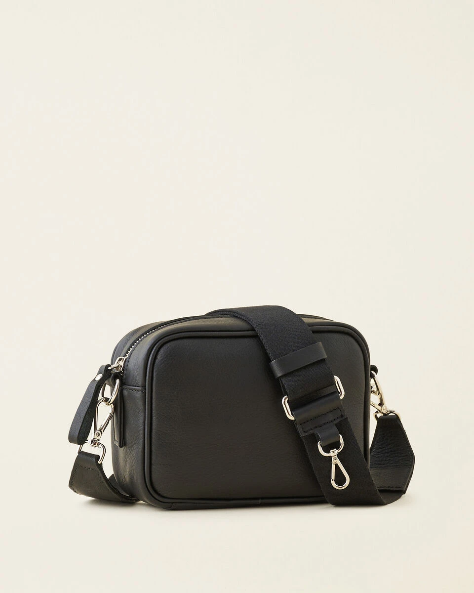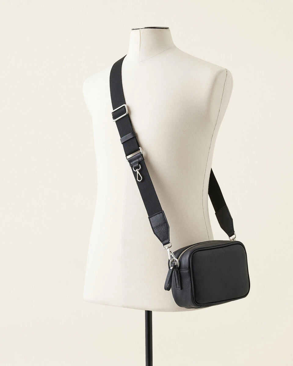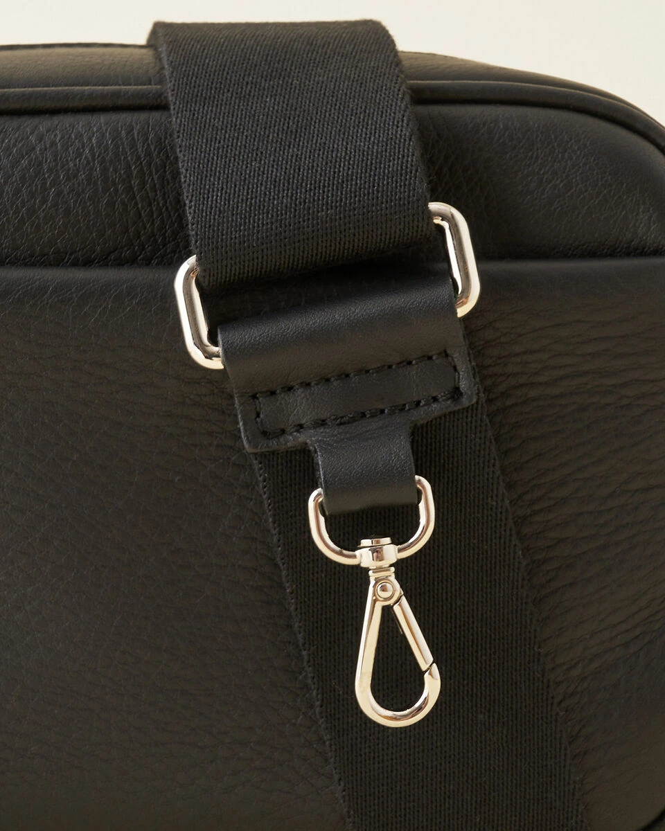 - Adjustable webbing shoulder strap with leather and dog snap detail